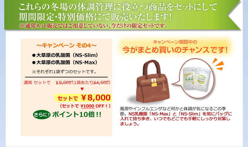 モンゴル大草原の乳酸菌「NS-Max」「NS-Slim」セットが通常9,000円のところ、一袋あたり500円オフのセットで8,000円!